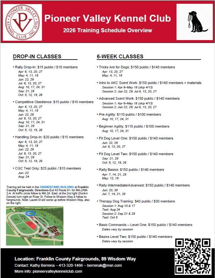 All classes are held at the Franklin County Fairgrounds, 89 Wisdom Way, Greenfield, MA 01096 in the Grandstand Building.