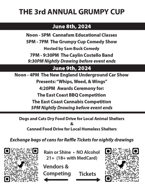 The Grumpy Cup is a festival hosting the 3rd Annual "East Coast BBQ Competition". To be held rain or shine in Greenfield Massachusetts on June 7 - 9, 2024 at the Franklin County Fairgrounds.